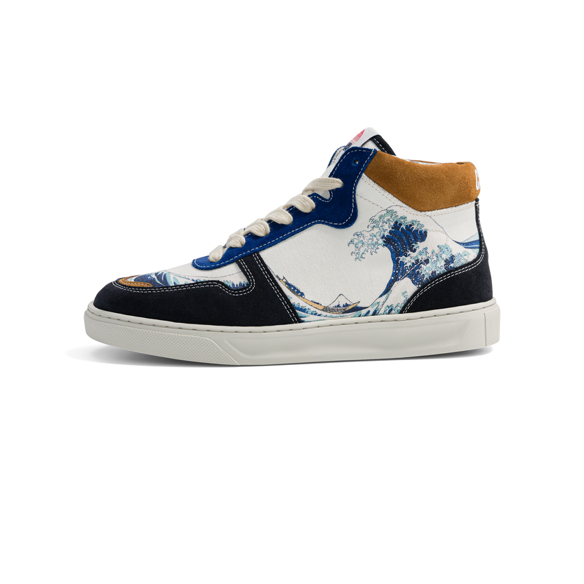 Les CAVAL x La Grande Vague de Kanagawa sont unisexes et asymétriques. Elles sont confectionnées entièrement en Europe avec des matériaux éco-responsables, traçables et labellisés. Voyagez à travers l'art et l'histoire avec nos sneakers CAVAL x La Grande Vague de Kanagawa, inspirées de la célèbre estampe de 1831 par Katsushika Hokusai. Ces chaussures montantes asymétriques fusionnent style moderne et patrimoine artistique, avec une impression en bleu de Prusse qui enveloppe vos chevilles dans une vague de confort et d'originalité. Après avoir captivé les visiteurs du Musée Guimet, du Metropolitan Museum of Art et du British Museum, ce chef-d'œuvre est prêt à transformer chaque pas en une déclaration d'art audacieuse.
