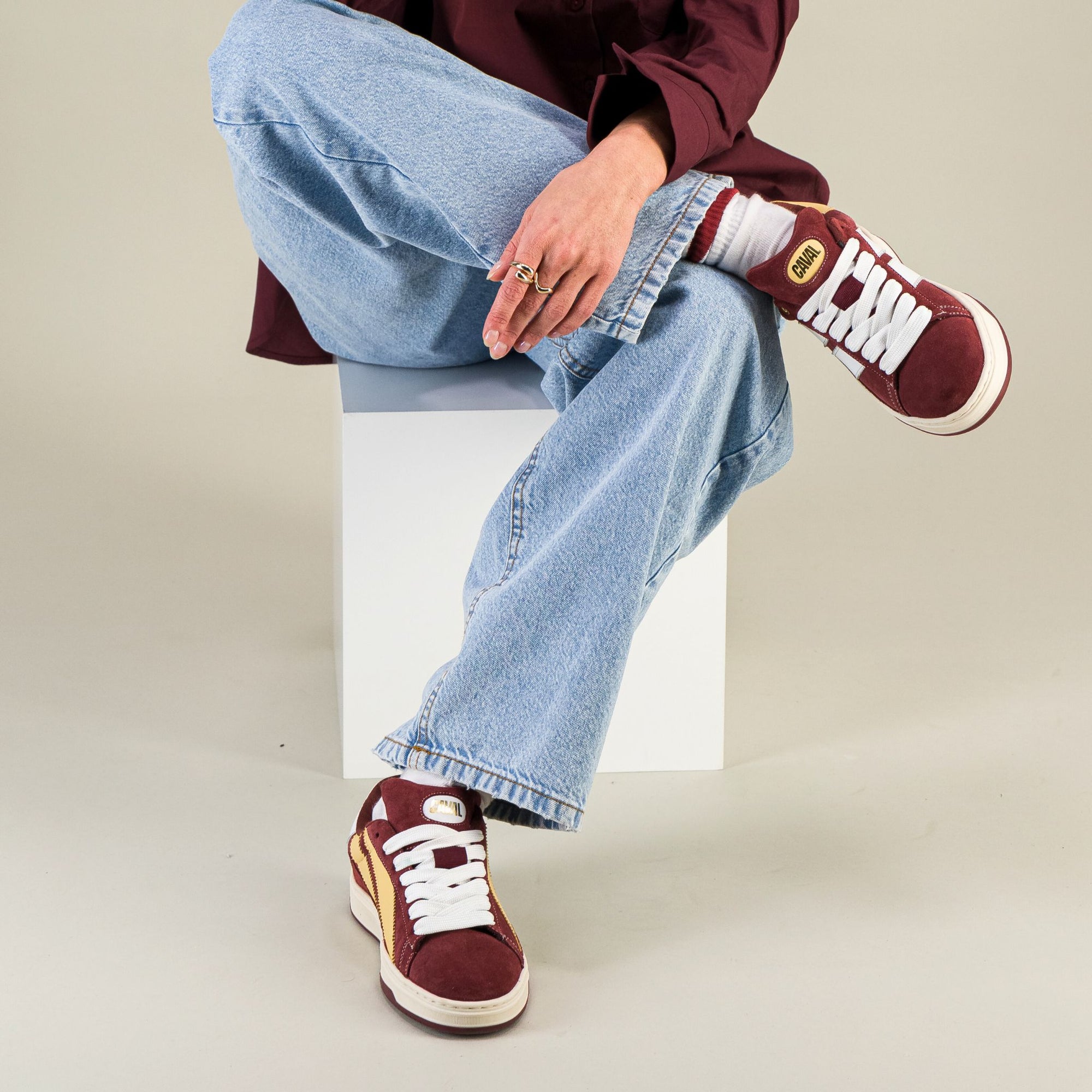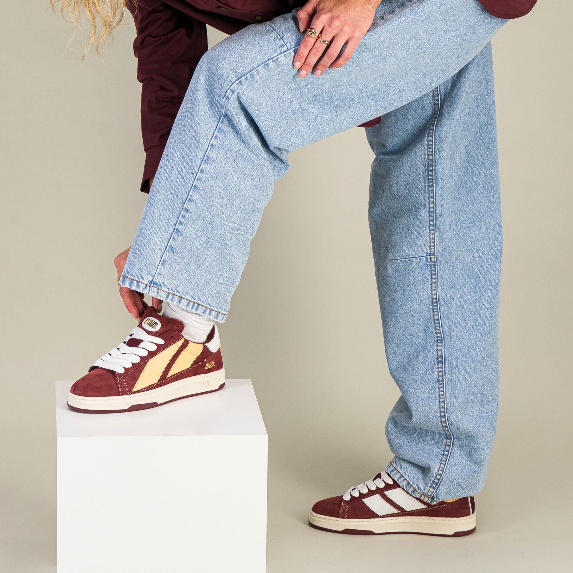 Les Crimson Dawn sont des sneakers asymétriques de la collection Ollie. Lacets XXL, languette moelleuse, semelle épaisse et design skateboard : défiez les contraintes de la ville et bondissez des deux pieds. 🔥
