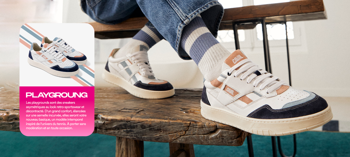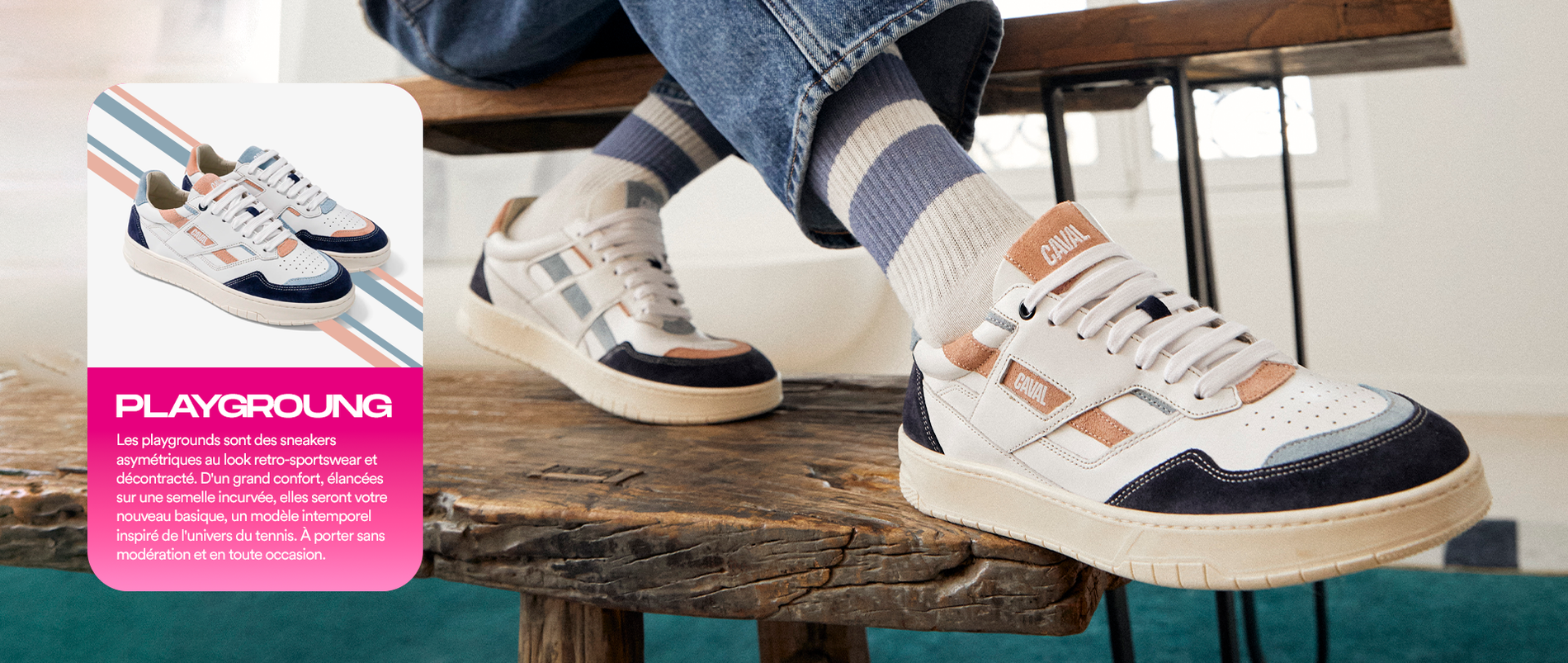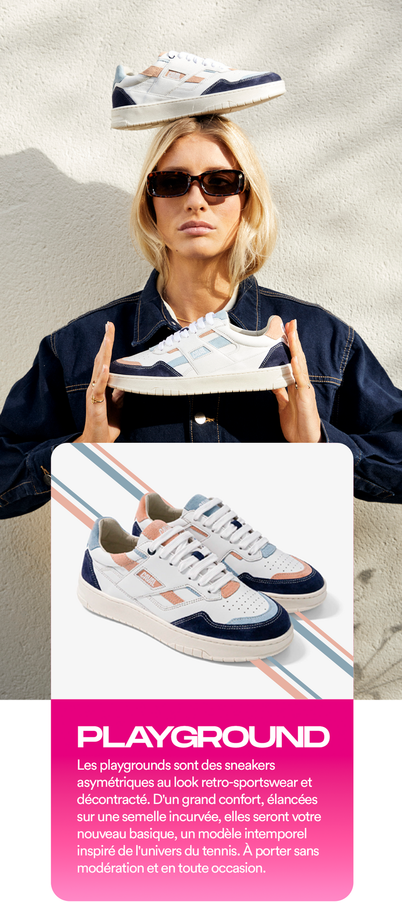 La collection Playground au look retro-sportswear et décontracté seront votre nouveau basique. D'un grand confort et élancées sur une semelle incurvée, c'est un modèle intemporel inspiré de l'univers du tennis. Les 7 différences sont à découvrir dans le jeu dynamique de superpositions des empiècements et des couleurs. À porter sans modération et en toute occasion.