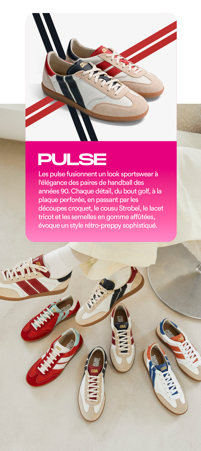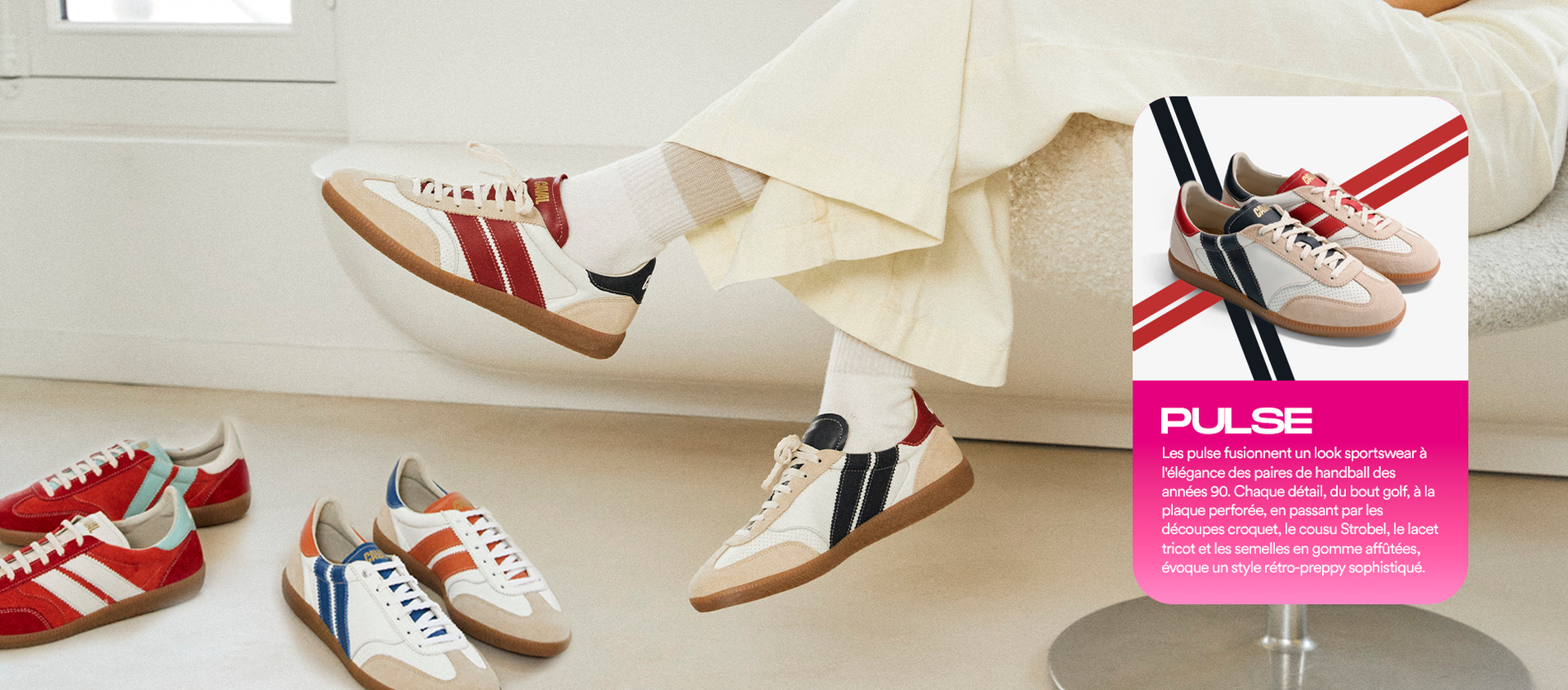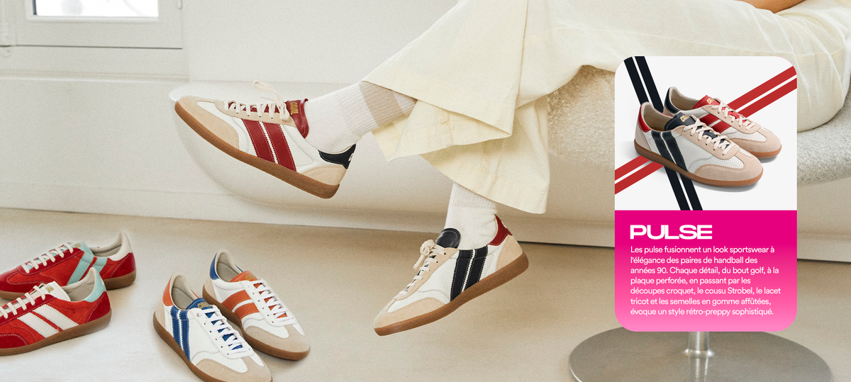 La collection Pulse fusionne un look sportswear avec l'élégance des paires de handball des années 90. Chaque détail, du bout golf, à la plaque perforée, en passant par les découpes croquet, le cousu Strobel, le lacet tricot et les semelles en gomme affûtées, évoque un style rétro-preppy sophistiqué. Souples et flexibles, elles promettent confort et allure pour toutes vos tenues.