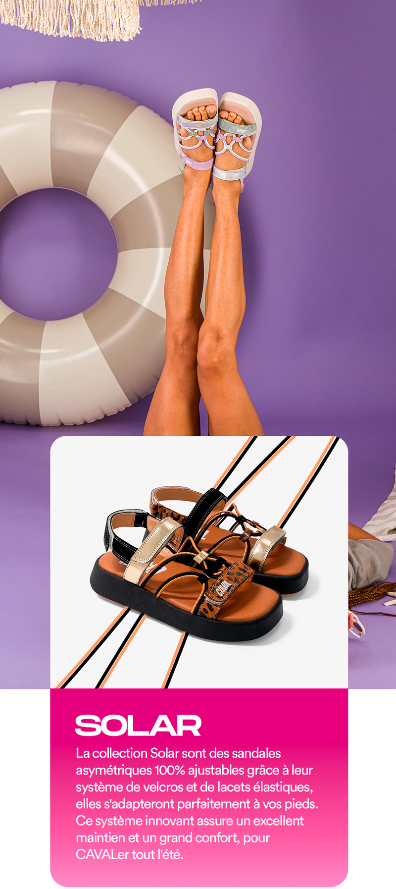 La collection Solar sont des sandales asymétriques 100% ajustables grâce à leur système de velcros et de lacets élastiques, elles s'adapteront parfaitement à vos pieds. Ce système innovant assure un excellent maintien et un grand confort, pour CAVALer tout l'été.