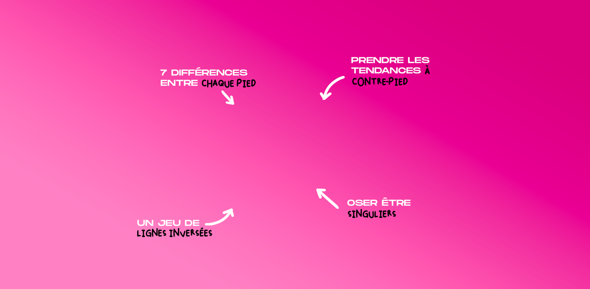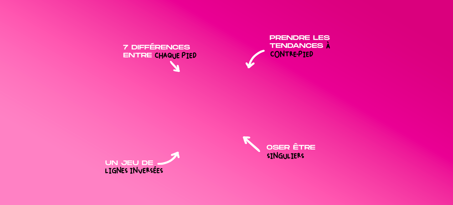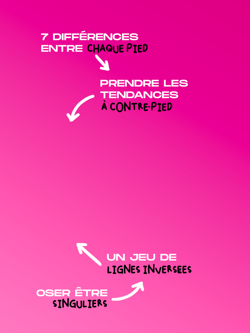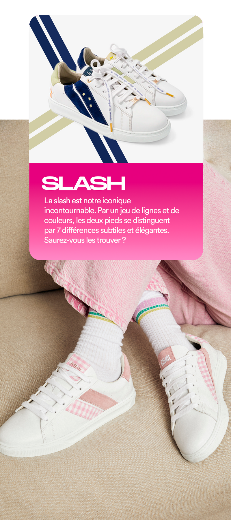 La collection Slash, iconique et incontournable. Par un jeu de lignes et de couleurs, les deux pieds se distinguent par 7 différences subtiles et élégantes. Saurez-vous les trouver ?