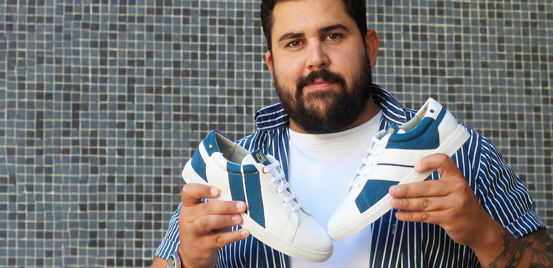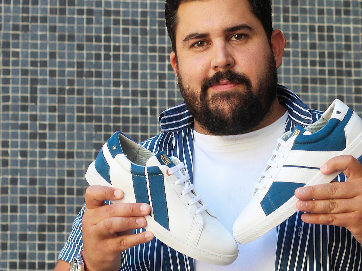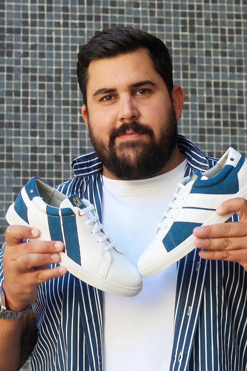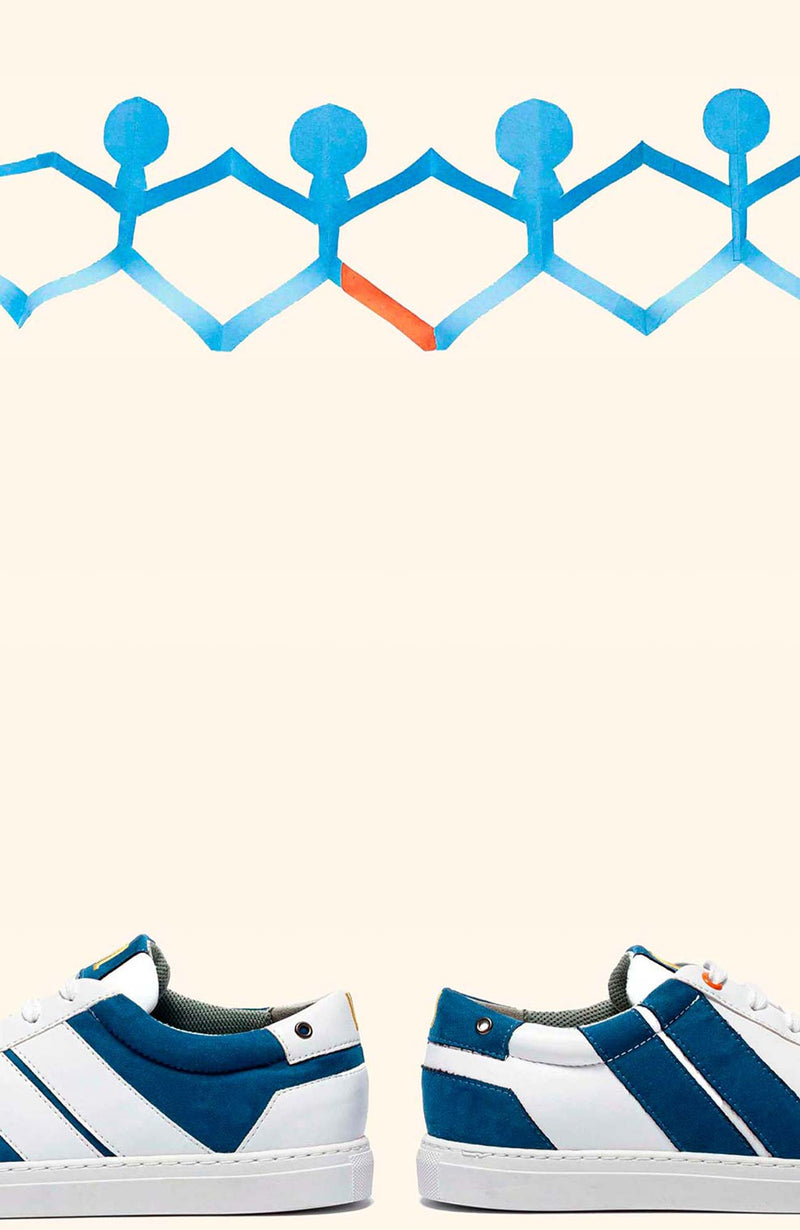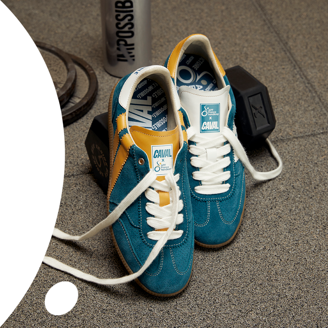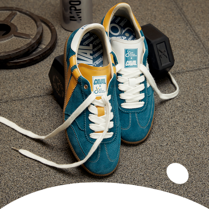 Les sneakers sont inspirées des couleurs vives d'APF France handicap : les doubles bandes jaune courage se répondent en miroir sur une base de cuir suédé bleu d'intégrité 💛 Une paire à l'harmonieuse asymétrie qui incarne l'audace, la victoire, et le respect.