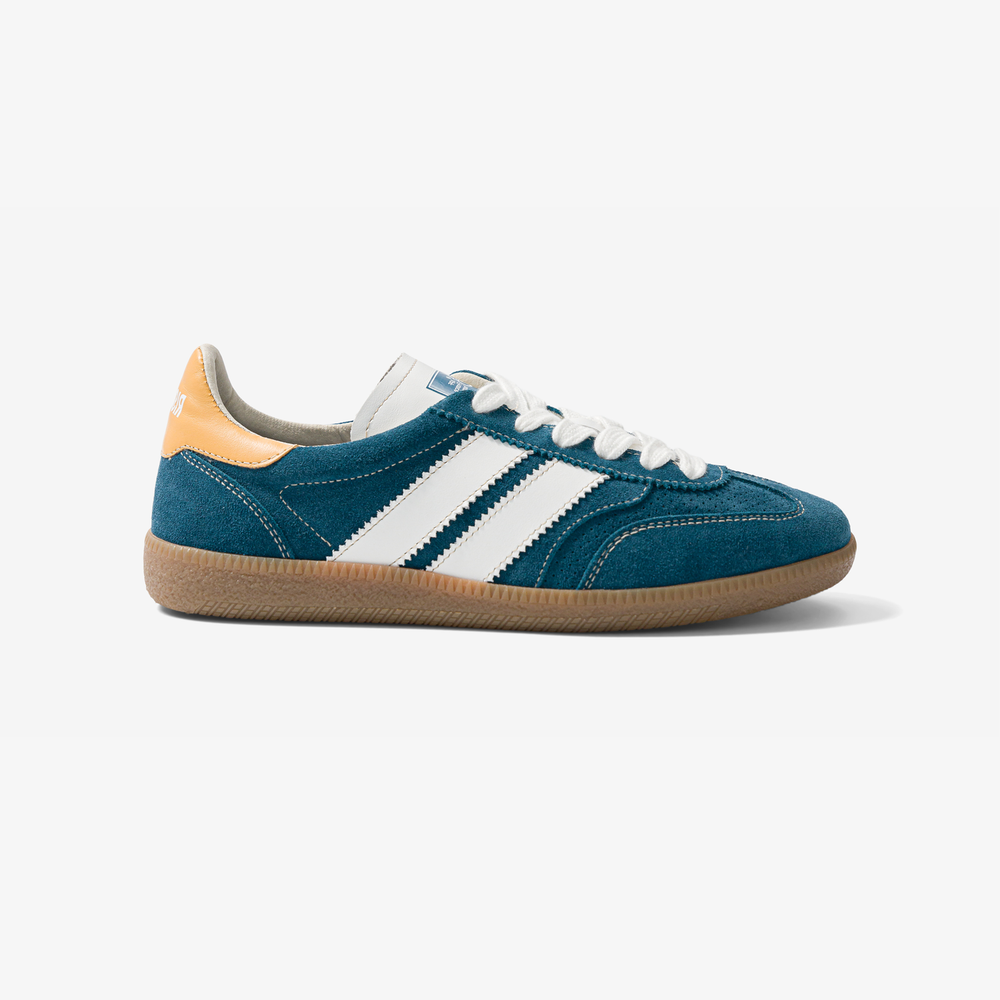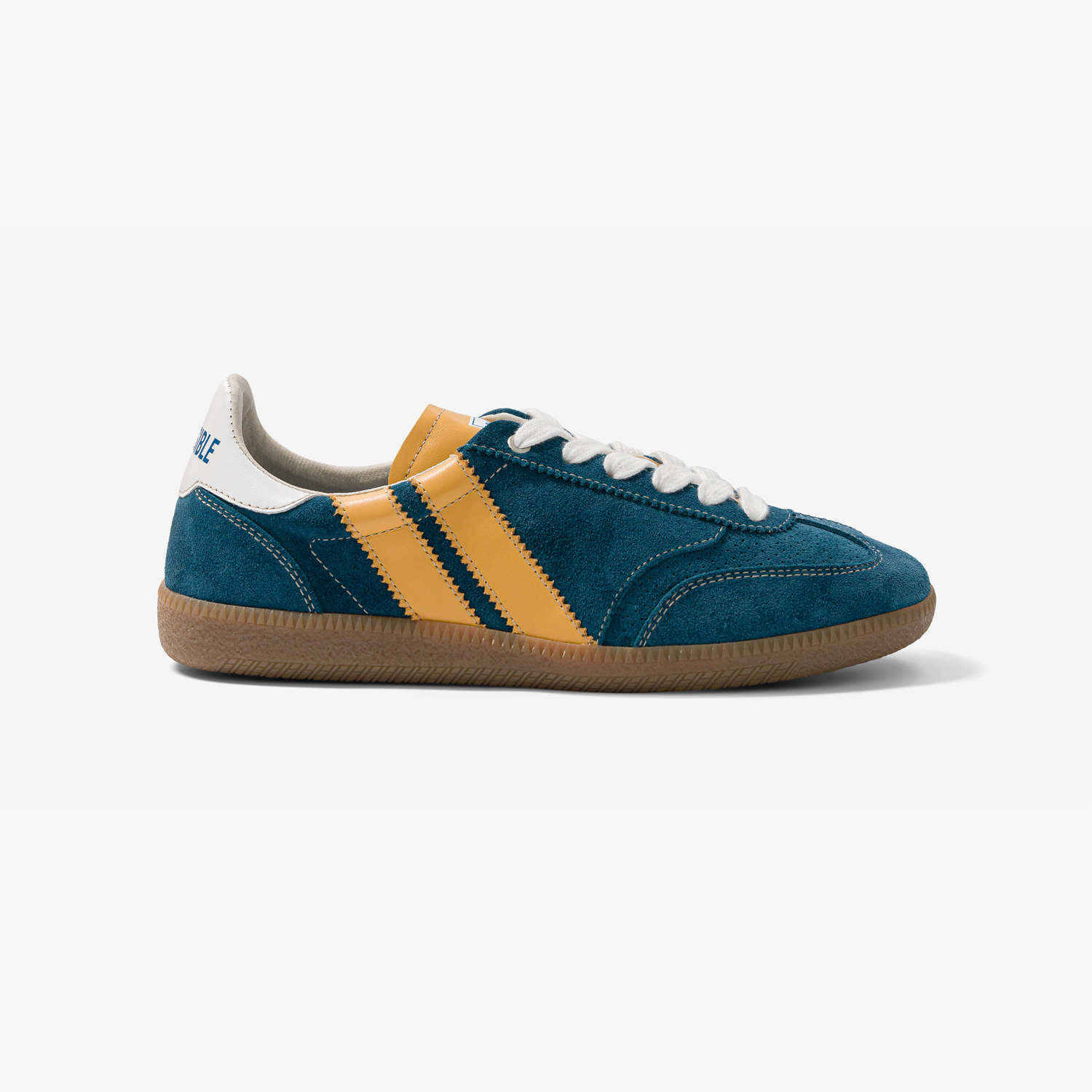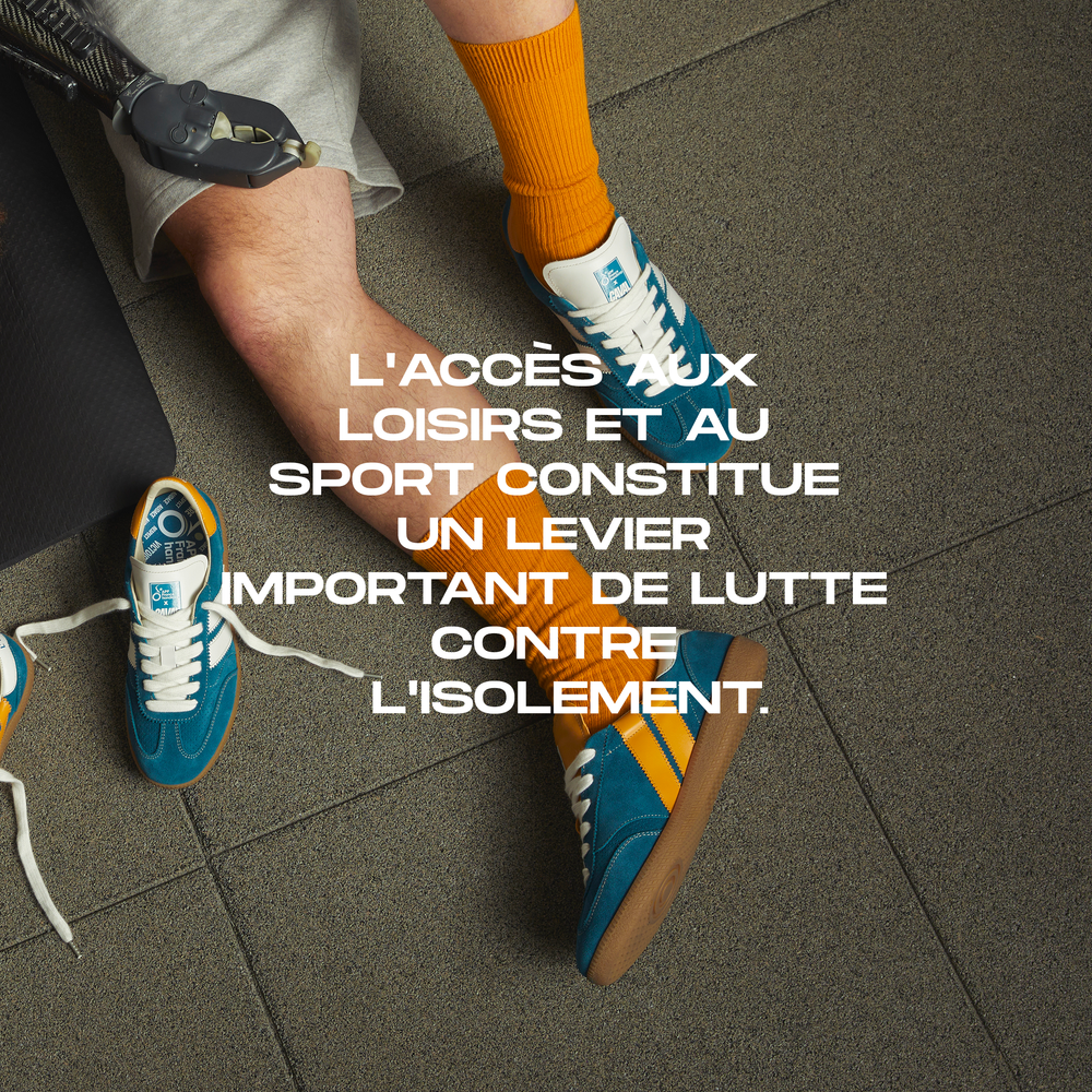Inspirées des couleurs vives d'APF France handicap, les doubles bandes jaune courage se répondent en miroir sur une base de cuir suédé bleu d'intégrité. Une paire à l'harmonieuse asymétrie qui incarne l'audace, la victoire, et le respect.