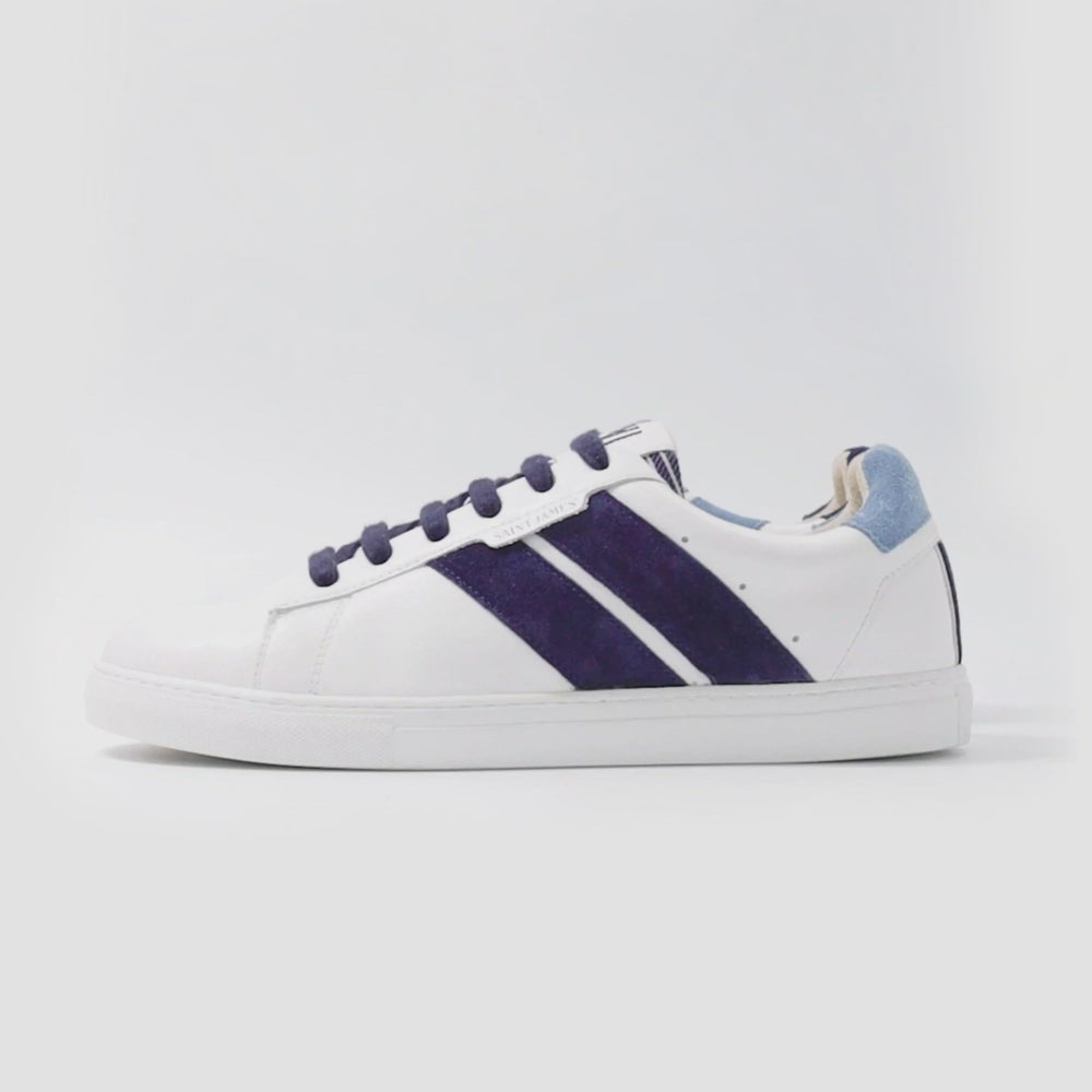 Notre modèle iconique Slash se pare des éléments phares de Saint James. Camaïeu de bleus océaniques en cuir suédé, sigle asymétrique des Maîtres Tricoteurs brodé sur les talons, œillet rouge carmin et surtout marinière qui habille les languettes.
