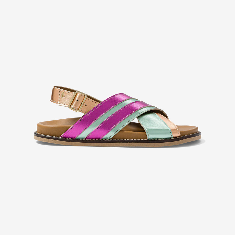 Les Leo Shine sont des sandales asymétriques plates avec brides croisées. Conçues pour allier style graphique et confort, elles s'ajustent parfaitement grâce à leur boucle arrière en métal réglable. Le cuir italien certifié LWG apporte souplesse, élégance et durabilité, tandis que la construction Fussbett offre un excellent soutien du pied au quotidien.